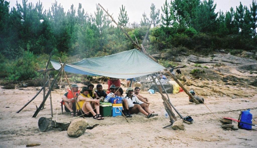 A meio da etapa, era já hora de fazer o almoço e, escolhido o local, não sem a tradicional discussão de prós e contras, aconteceu o desembarque geral. Depois de se tirar das canoas todo o material necessário, os engenheiros de serviço montaram o toldo. Dava gosto ver a solução adoptada a cada dia, resultado das condições do local e dos palpites desencontrados dos “especialistas”. O facto é que, no final, havia sempre sombra para a cozinha improvisada, e para os comilões. O almoço não era uma coisa qualquer. Sempre foi considerada importante a preparação cuidadosa dos petiscos, não só para agradar às bocas mais exigentes, mas também como um exercício criativo da arte culinária por parte dos cozinheiros. E, enquanto se aprontava o prato principal, desbastavam-se os aperitivos. Mas estou a relatar muito depressa, é melhor voltar um pouco atrás. Enquanto os mais acalorados davam mergulhos no rio, os mestres-cuca do costume, com a ajuda de mais alguns, começaram a preparar o almoço. Foi então que deram por falta de um ingrediente indispensável. Verificados todos os sacos e vistoriadas as canoas e os caiaques, a evidência chegou: as cebolas tinham ficado no acampamento. Destacaram-se voluntários para visitar as quintas em redor. Alguma delas poderia resolver o grave problema culinário. E assim foi. Com elas na mão, a expedição retornou triunfante, e os chefs prepararam o repasto, delicioso como sempre. Contudo, daquela vez, não foi apreciado como merecia, devido à chuva inesperada.