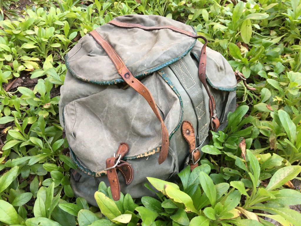 Volumosa, a minha primeira mochila destaca-se. De lona verde e correias de cabedal, foi uma oferta do Instituto da Juventude, no final dos anos 70. Dentro está o velho cantil que me acompanhou por muitos montes e vales. Está lá também o que sobrou do meu primeiro saco-cama, comprado no supermercado Invictus por mil escudos. Era fraquinho, mas serviu enquanto não tive melhor, e foi abrigo em muitos acampamentos, mesmo de inverno. Arruinado por ácido de uma bateria velha durante uma semana semana em trabalho de campo, foi cortado para fazer uma mantinha.